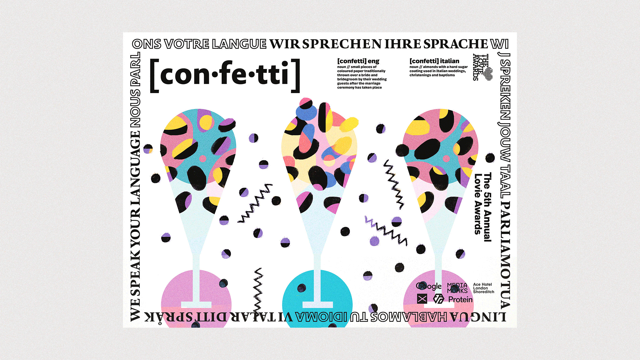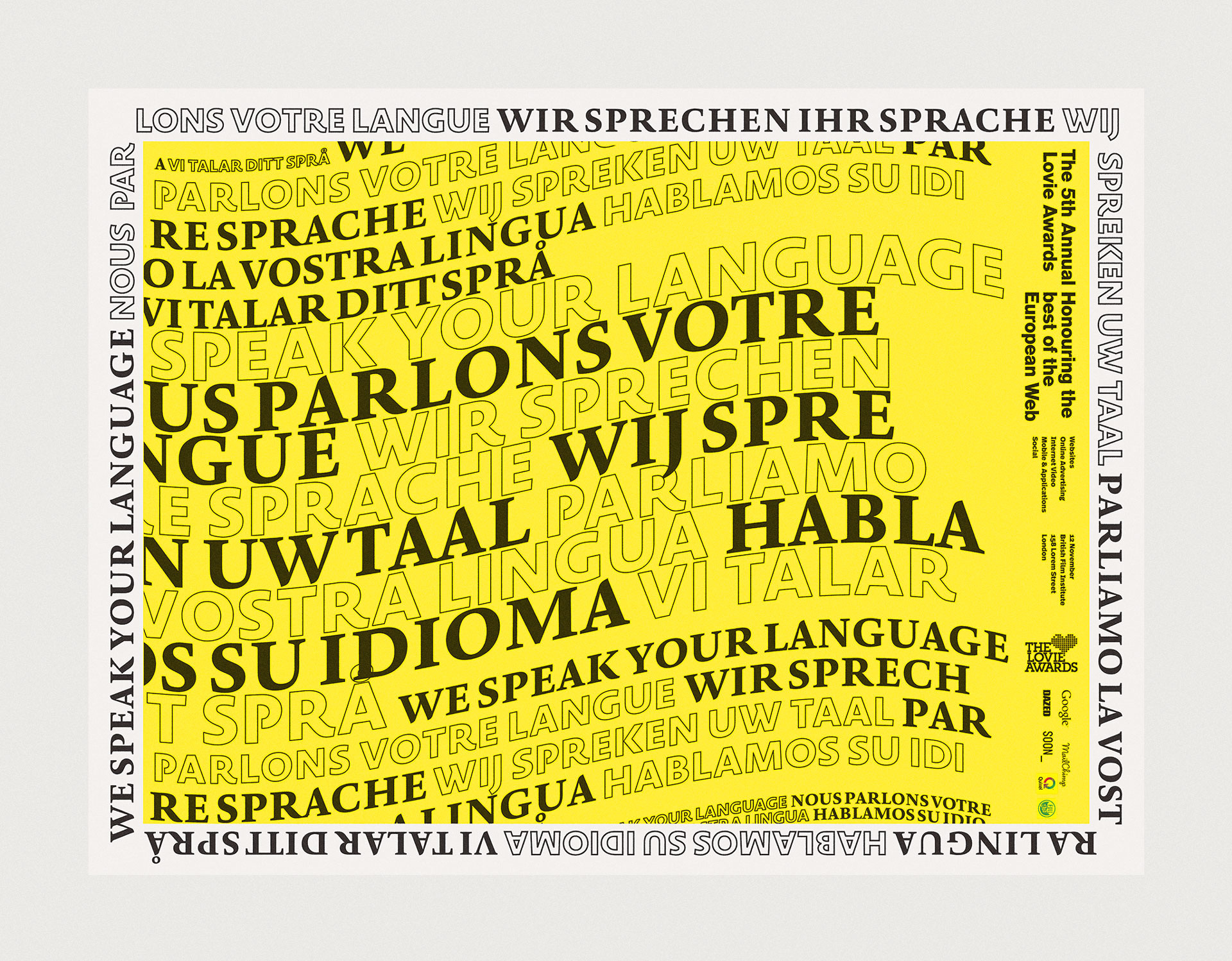 Making it easy: The concept - The Lovie Awards We Speak Your Language. Making it tricky: False Friends as storyteller. Making it fun: To articulate a conversation showcasing the meaning, it's loss, building new narratives mixing the 7 different languages of the 7 most important awards/jury members. Making it conscious: To be precise, respectful in style, contemporary in composition, historic in typographic form and experimental in illustration as a way to honor the groundbreaking creative ground that is intimate to Europe as a whole.