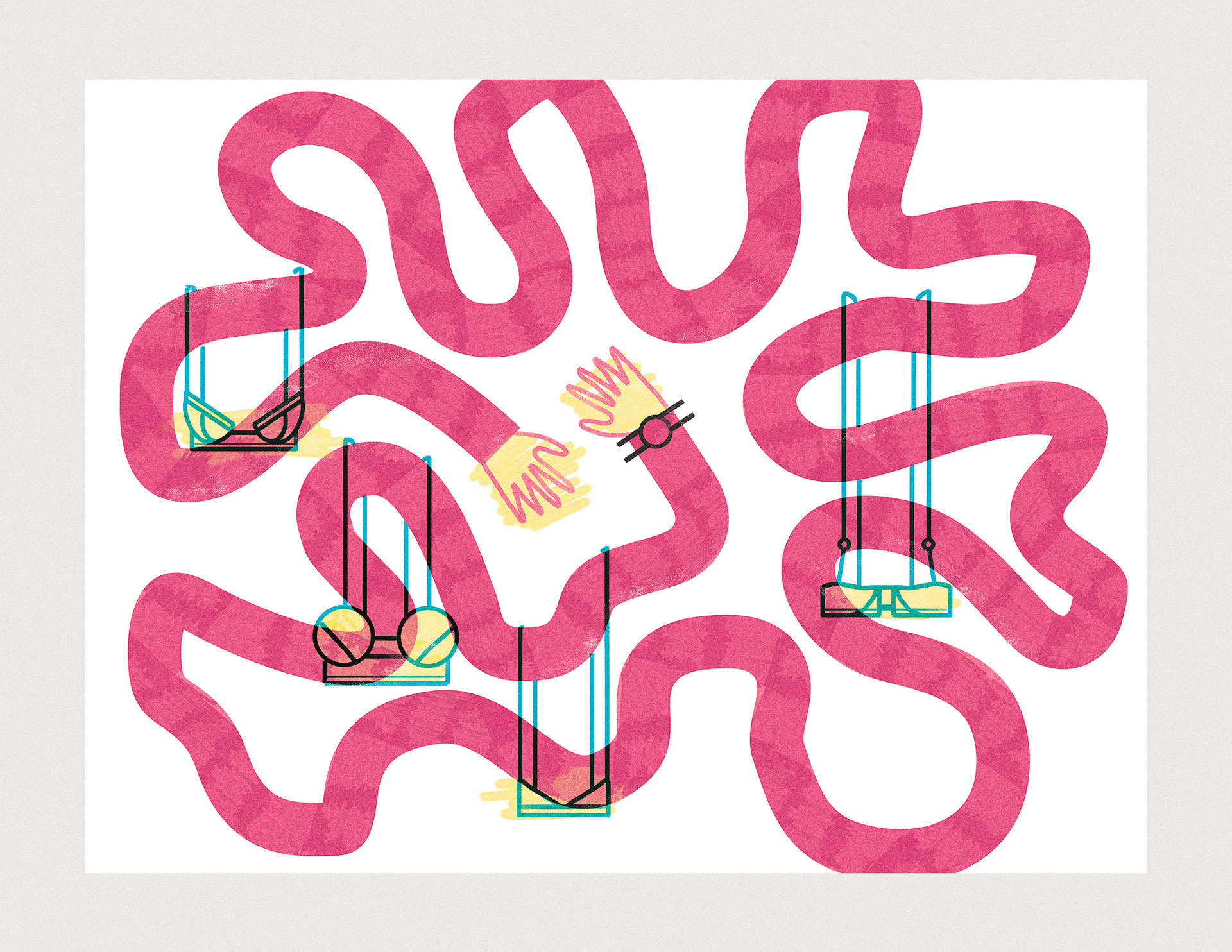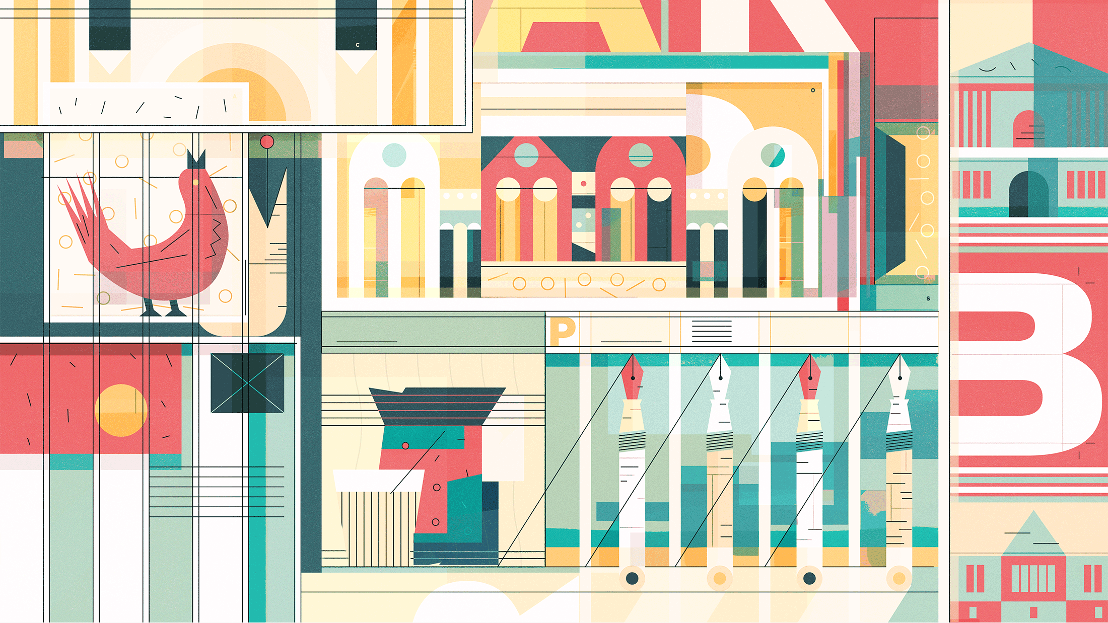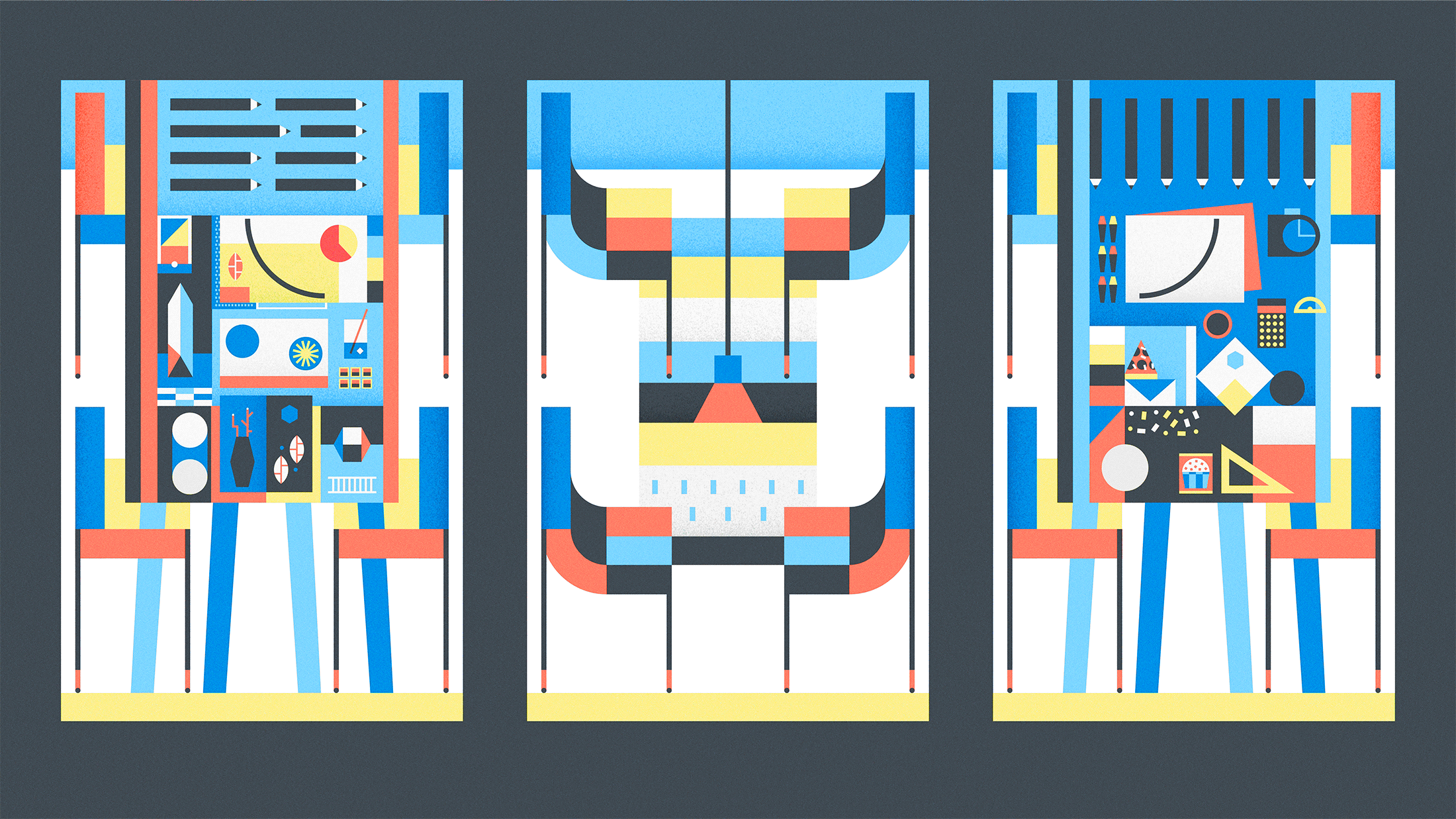 Illustrator - Intro to Live Shapes: Poetic approach to workflow and simplification in the design process | Clear empty space to be filled via the absence of one main composition element (Smart Spacing) | Total alignment and distrubuition of graphic elements in direct connection to smart spacing and organization process | OCD storyteller as the conveyor or alignment and balance | Smart shapes (line, elipse & polygon) in clear representation on the design spaces as part of the artwork | Chairs varying in form in connection to Smart Shapes and live editing of fixed shapes.