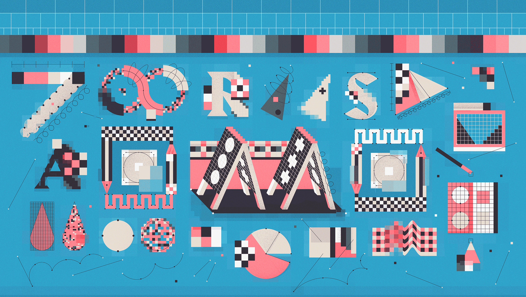 Photoshop - Rasterizing a Vector Shape: Poetical material storyteller bridging vector graphics with papercuts — the process of materializing a vector in connection with Rasterization | Direct UI references to vector attributes such as anchor points, curves and path gradients Digital abstraction showcasing pixel behaviour in shape and color | The vector as an ever-changing shape | The Raster as a pixel-detailed dimension | The infinite nature of the vector vs. the finite dimention of the rasterization process Overlap of form to showcase the backend process between vector and raster | Process workflow hint between the vector notion of stroke vs. bitmap brush