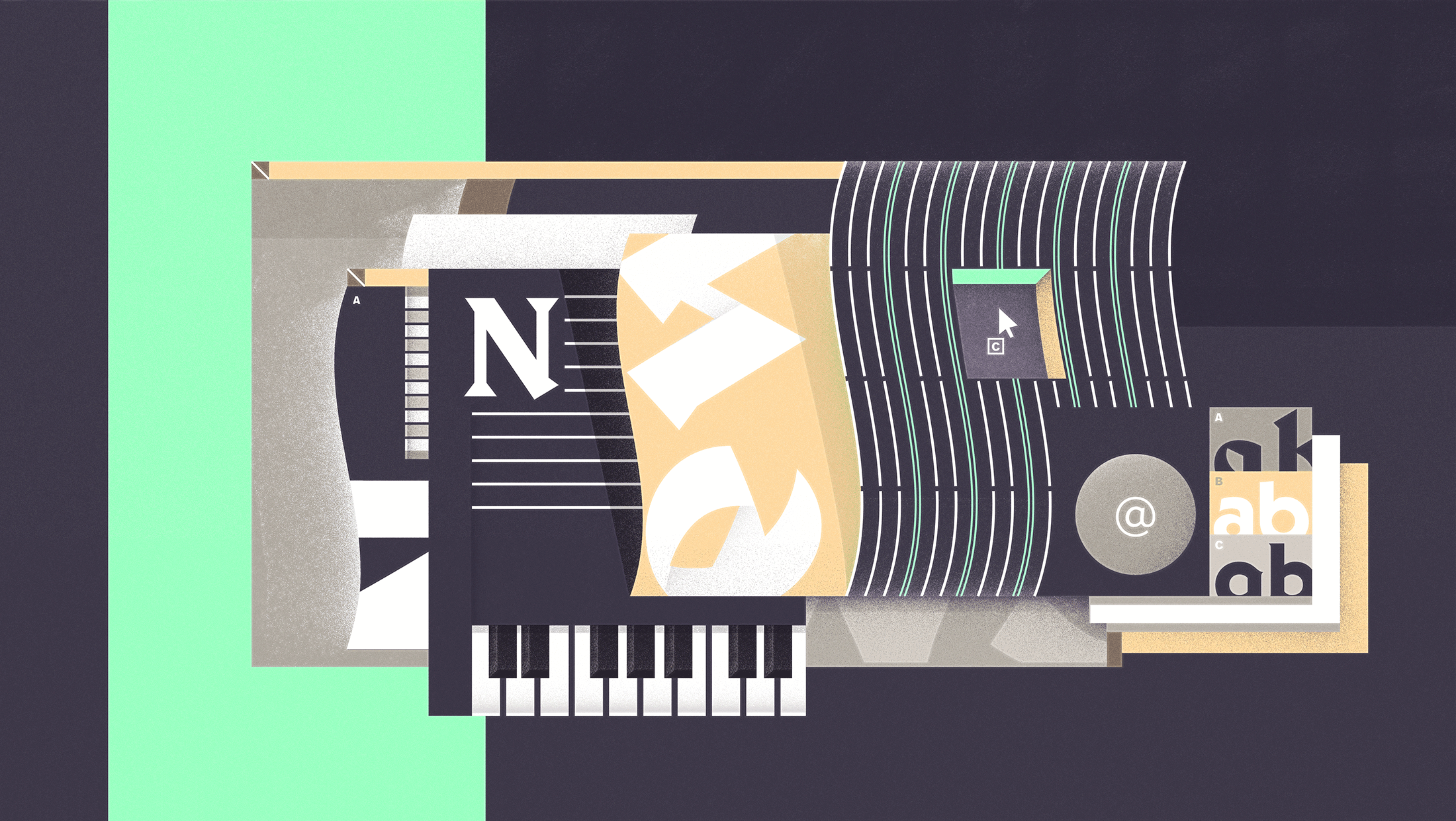 InDesign - How to Design a Newsletter: Technical Storytelling | Emphasis on processual elements and the act of designing | UI and Theme elements bridging realities between the act of design and the element to communicate | Musical elements in wireframe as part of the UI, bridging placeholders and assets | Layout elements | Margins and Layout | Styles (generic — character and paragraph styles) | Multiple pages in a strict connection to multiple styles and the act of scrolling with it’s native cropping | Multiple pages connecting newsletters to the editorial newspaper | Cursor, Typography & placeholders as a technical references.