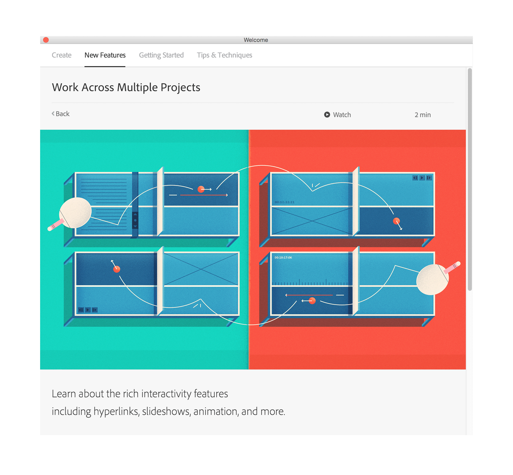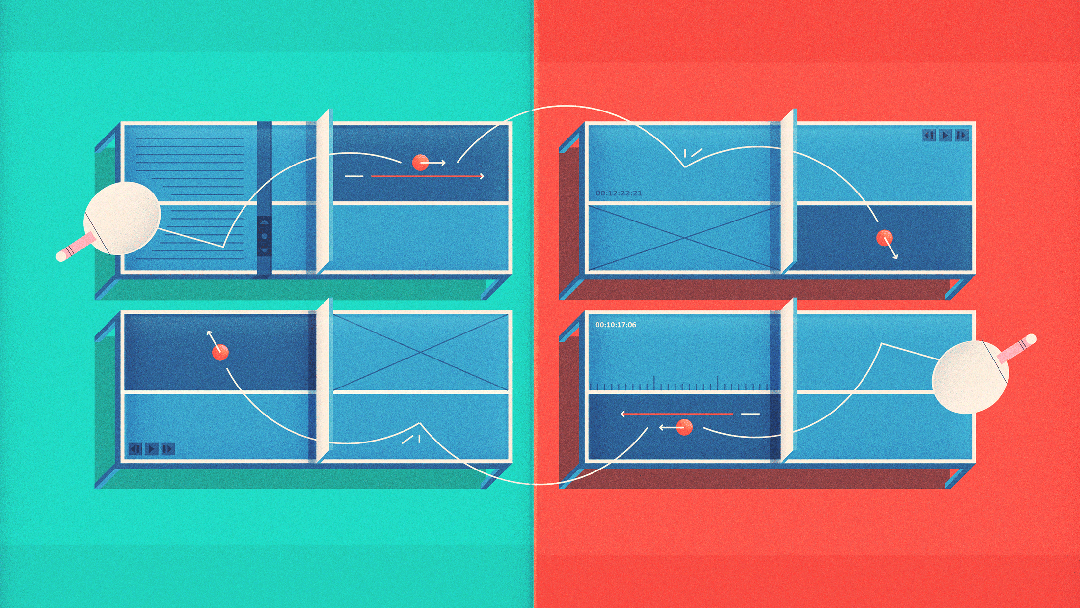 Premiere - Work across Multiple Projects: Poetic approach to the workflow as a soft and expressive environment | Ping Pong as a reference to multiple projects and active relationship | 4 tables as the workflow | Library preview | Live Preview | Library