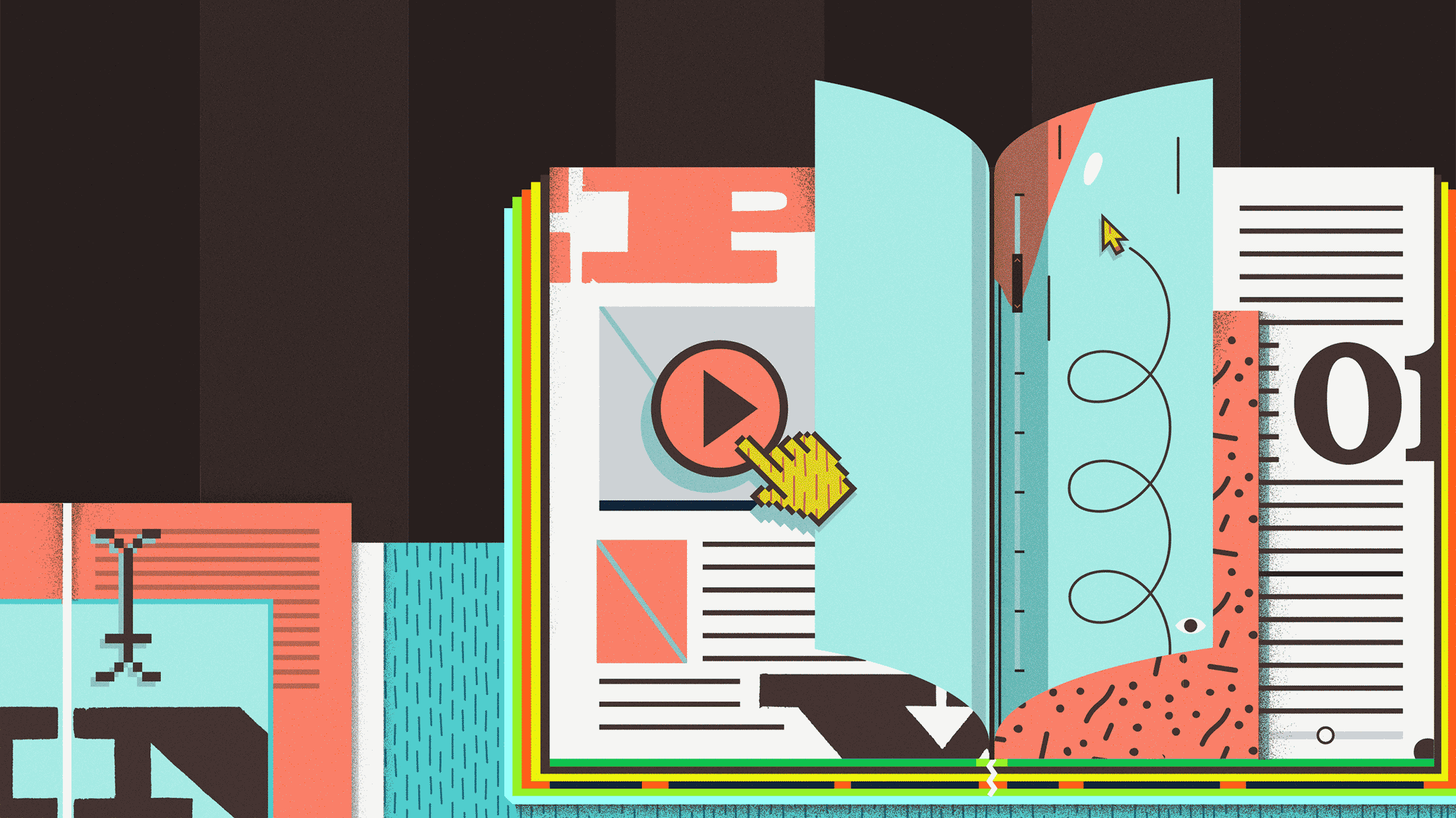 Interactivity and Preview in Fixed Layout EPUB: Display of interactive elements over fixed composition with strong editorial context | Integrated UI elements of both InDesign and digital interface | Cursor hold & Cursor Pressed | Poetic storytelling of an open book crossed with interface elements to enhance digital content over a dynamic narrative.