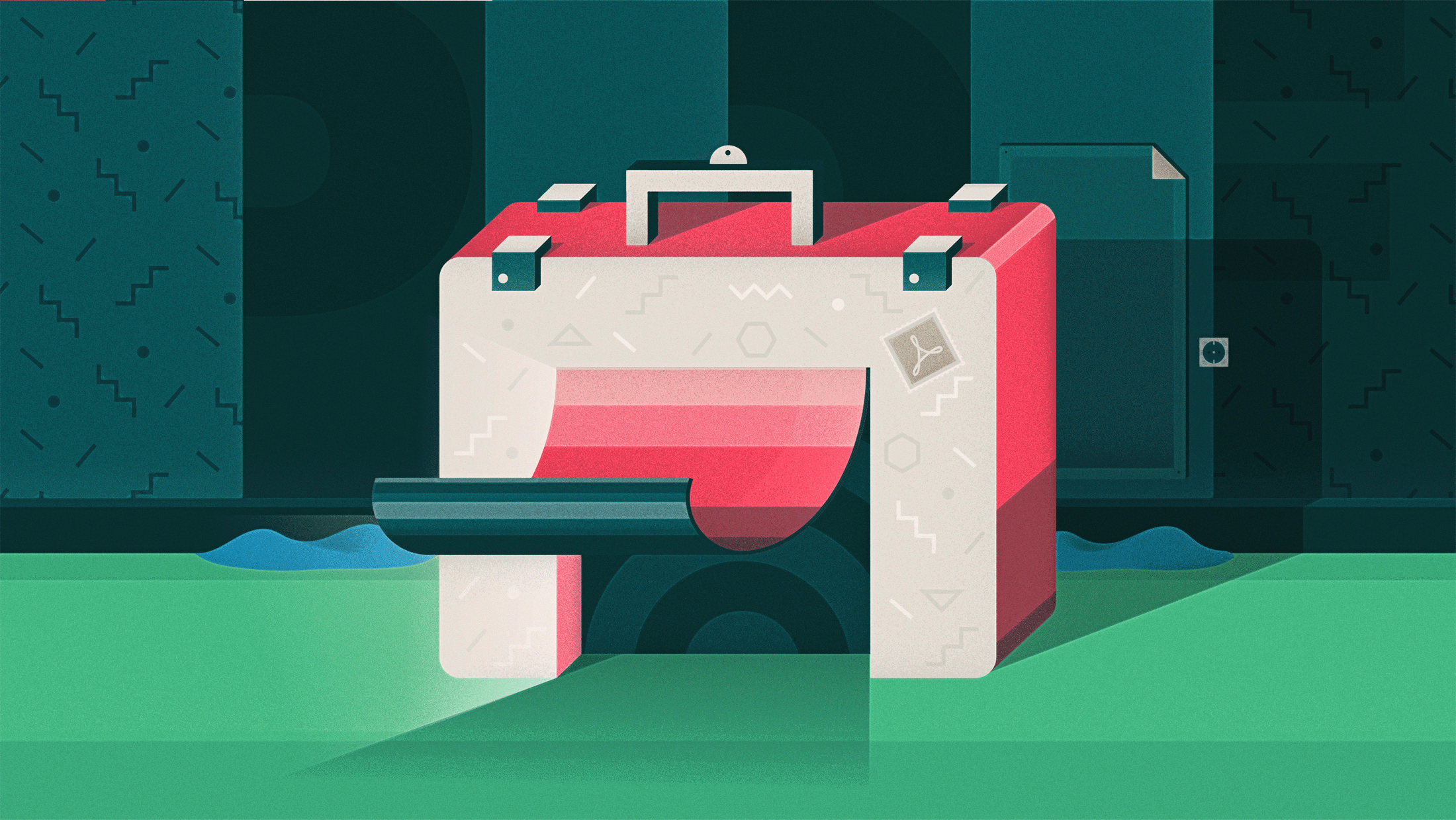 Acrobat DC - Convert PDF Files to Microsoft Office: Poetic approach to switching software | Symbolic elements in corporate and balanced composition to allow neutral communication to a broad targetOffice briefcase as a referral to the output file for Microsoft Office| Iconic approach to image to empower rigorous and broad concept language | Dynamic composition with balanced color approachOffice briefcase as output (the navigation between softwares, to go into the office, transition) and PDF as input | PDF stamp as a reference to the original source (passport stamp).