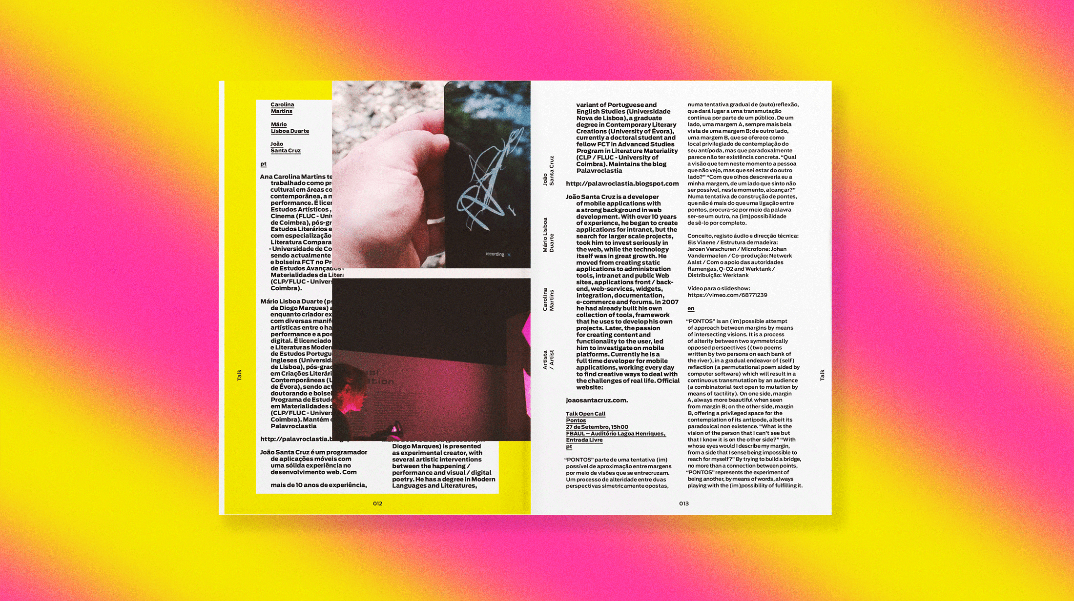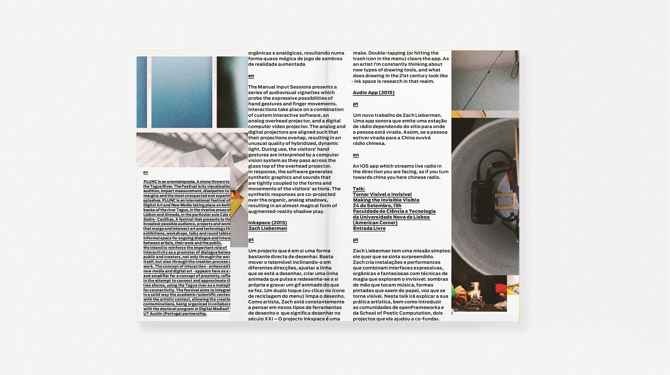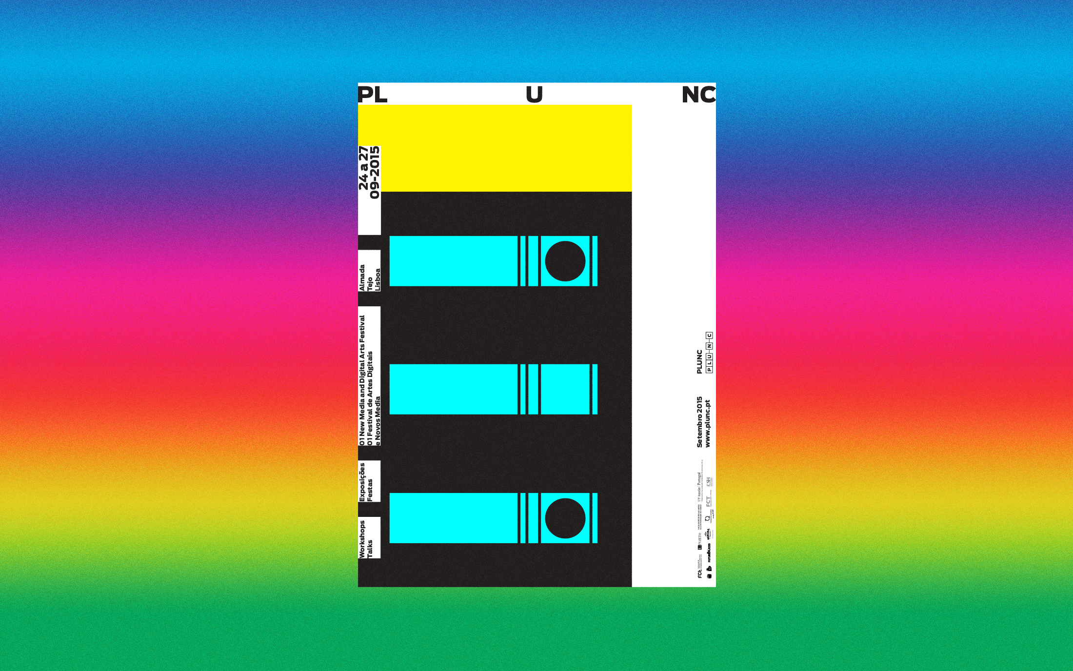 PLUNC is a technological journey between the two banks of a river and a hybrid between communication and geographical space. As an experimental stage, the identity reflects the dialogue between the abstract and the figurative - a symbolic approach that characterizes the experimentalism, the connection, the code and the expressive elements. From a symbolic standpoint, the approach promotes dialogue between the figurative and experimental - the connection and the marginal, the scope, the interface and the user. Based on a visual system where language sets the tone of the communication Plunc is a coded system synthesis and message: a figurative stage on which the message is not restricted to a single illustration but to a graphic lexicon - 11 infinite posters in loop and a responsive system dictate the language. Among the synthesis and the system, just like the bank and the rive rises the creative freedom and the strength of the narration. The water and the reflections. The final reason ing in compositing the symbols is thrown to the background, allowing only the data and rules to define the visual system, looking forward to reach the abstract. The image as a reflection of the concepts and the concepts as the genesis of a lexicon. A code. Plunc.