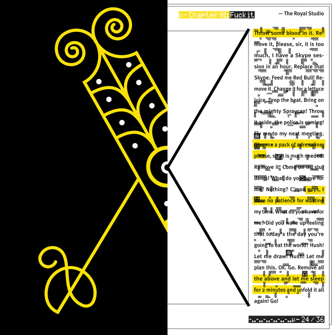 In line with the irrational narrative that derives from false-friends (using English as the main language), we empowered each combination of 2 unrelated concepts without trying to make rational sense between the two as a tool for narration, in one coherent and strict identity system.