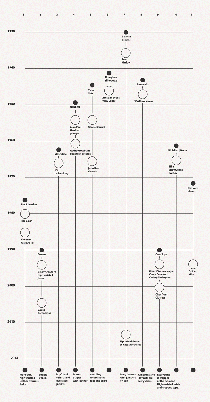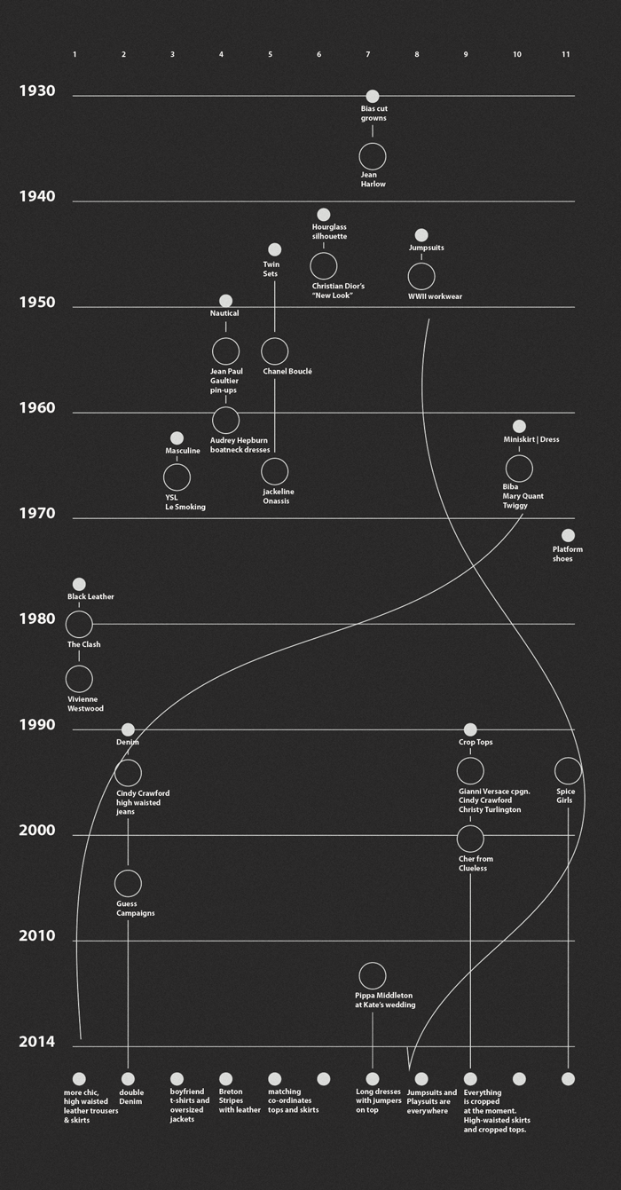Approaching 2014's London Fashion Week, Yahoo Lifestyle UK gave us the hard previledge to dig deep in the world of information, data and ultimately: fashion. Made for the web only, here is an exclusive on the evolution of the hottest fashion trends today over the course the decades from the 30's nowadays.